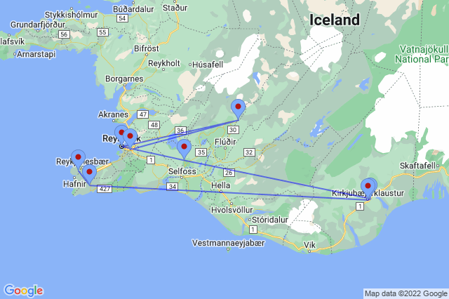 - Accommodation outside of Reykjavik in superior hotels with private facilities and breakfast included (drinks paid locally)