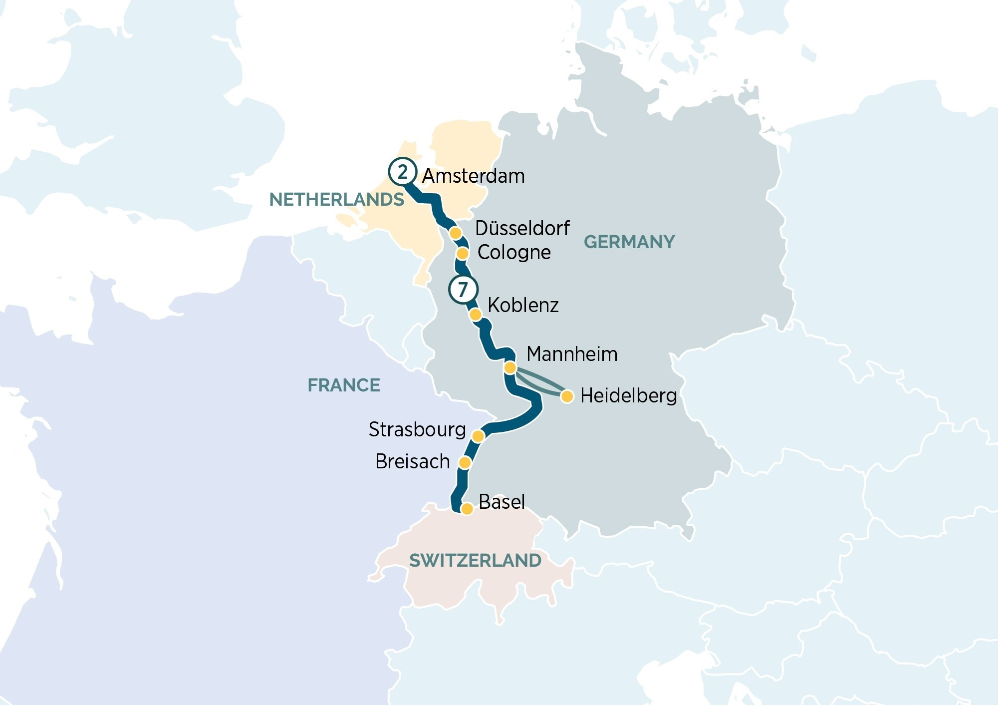 Start with a two-night in Amsterdam then explore modern and quintessential Holland on a glass-top canal boat cruise through Amsterdam, before sailing through the countryside and witnessing traditional windmills. Enjoy a guided walking tour of magnificent Cologne and the juxtaposition of ancient Koblenz, continuing upstream to Heidelberg. Soak up Strasbourg’s beautiful architecture and visit Freiburg a Black Forest destination.