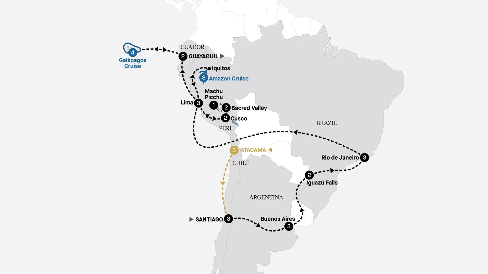 Dive into the heart of Chile, Argentina, Brazil and Peru. Explore the Peruvian Amazon rainforest, sail through the Galápagos Islands and be awestruck by Iguazú Falls, the Sacred Valley and Machu Picchu. Plus stays in Santiago, Buenos Aires, Rio de Janeiro, Cusco and Lima.