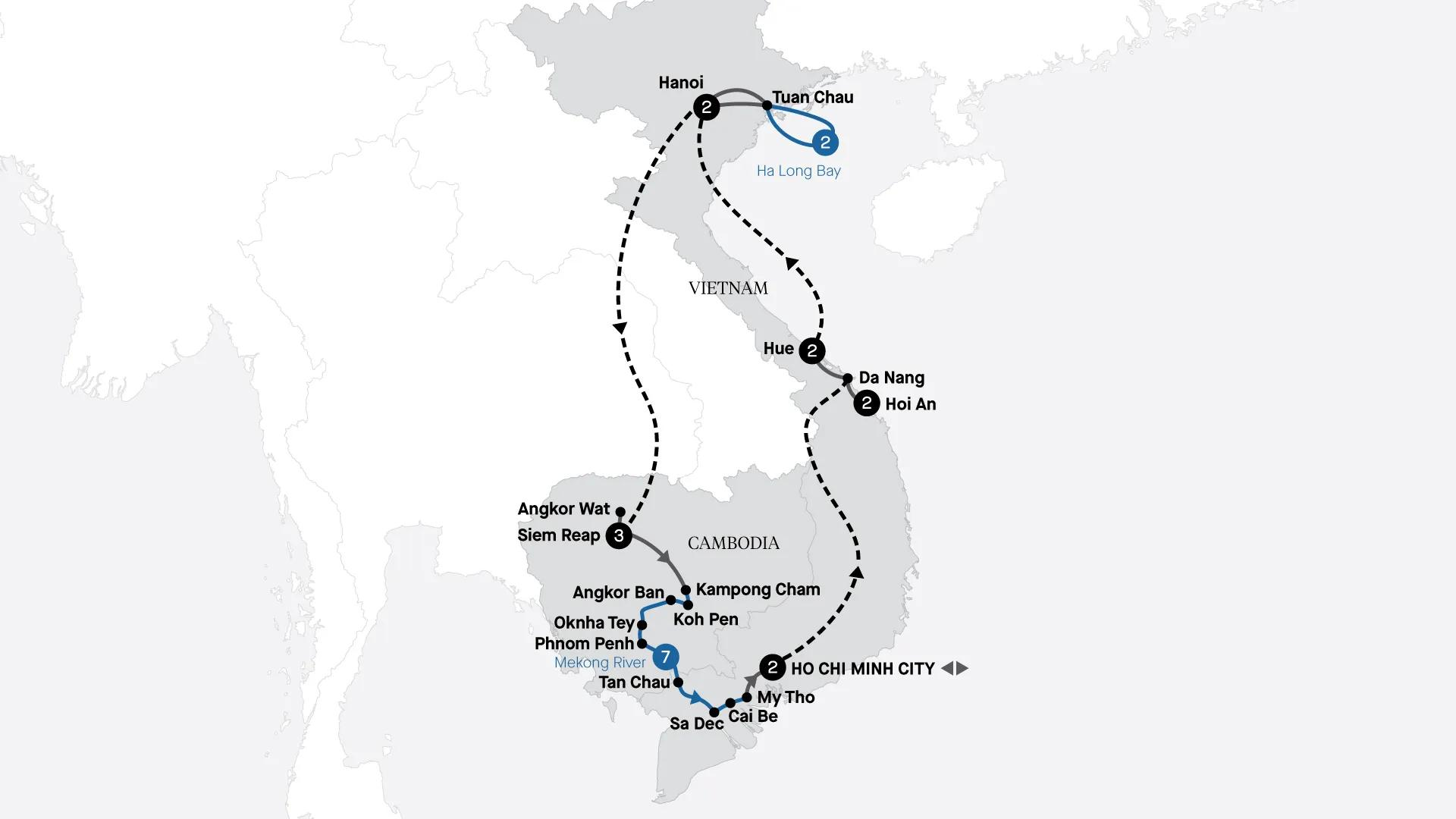 See the highlights of Vietnam and Cambodia. Discover Ho Chi Minh City, Hoi An and Hanoi. Spend three days cruising on Ha Long Bay, and seven nights on the Mekong River aboard the luxurious Mekong Serenity. Watch the sun rise over Angkor Wat, and glide along the Perfume River in Hue.