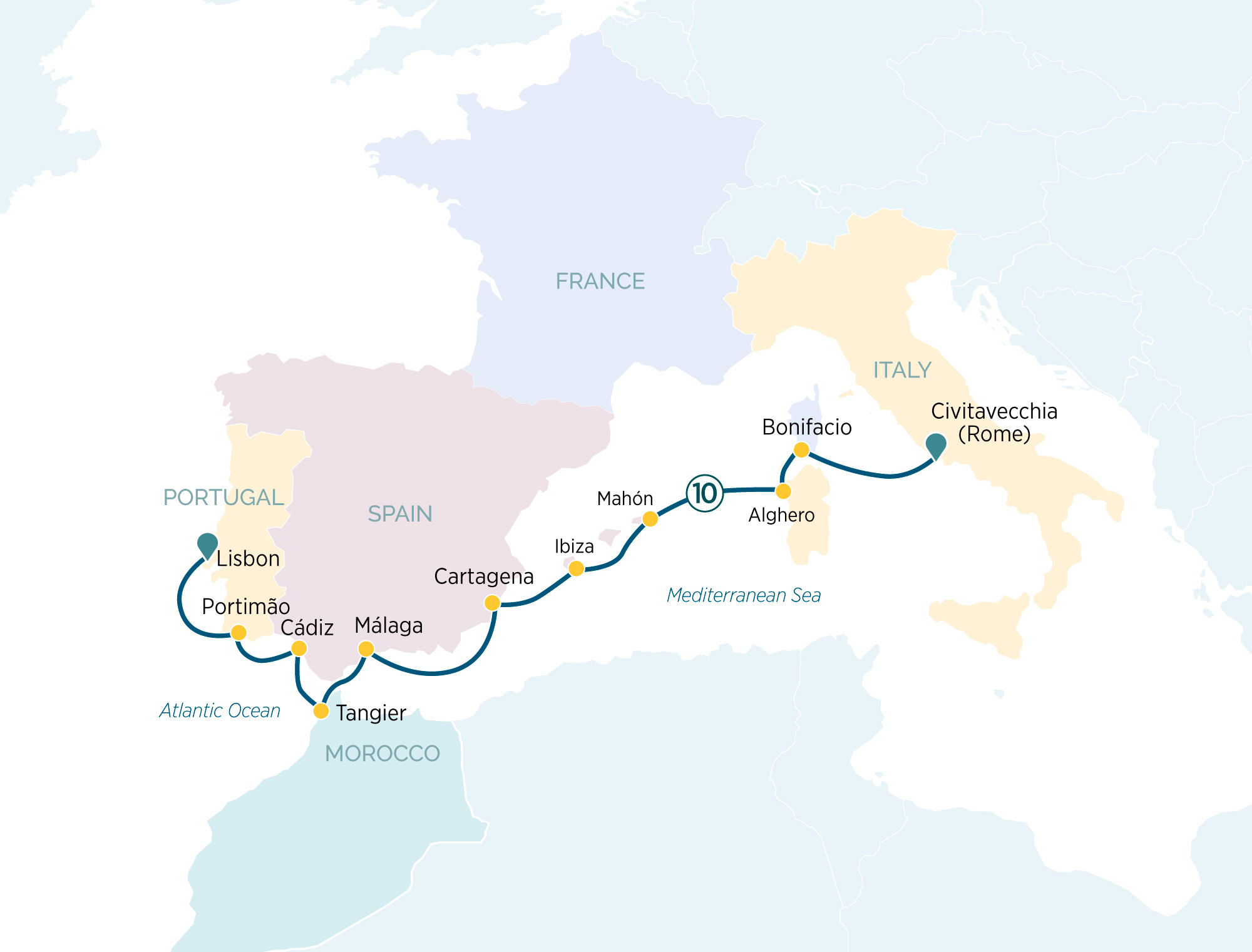 Ticking off five countries in one spectacular voyage, this 11-day luxury yacht cruise will bring the Western Mediterranean to life. Begin your memorable voyage in Portugal and the picturesque capital, Lisbon, before setting course along the Atlantic Coast for Portimão, at the heart of the beautiful Algarve region. You’ll make a stop in Spain’s stunning Andalusian region for Cadiz, considered the oldest continually inhabited city in Europe, before cruising south to North African shores and exotic Morocco. Here, in Tangier, soak up the feast of sensations and aromas and explore the Old Town and its colourful markets. Back in Spain, enjoy the pretty beaches and hedonistic lifestyle of Ibiza, the stunning beauty of Menorca, the most relaxed of the Balearic Islands and on the mainland, the rich culture of Malaga, birthplace of the celebrated artist, Picasso. Swim in the crystalline waters off the gorgeous Italian Island of Sardinia, then explore the medieval French town of Bonifacio in Corsica, before concluding your memorable voyage in Civitavecchia, a historic seaport and gateway to the Italian capital, Rome. Immersive experiences will introduce you to the wonders of each destination and allow you to connect with the local people.