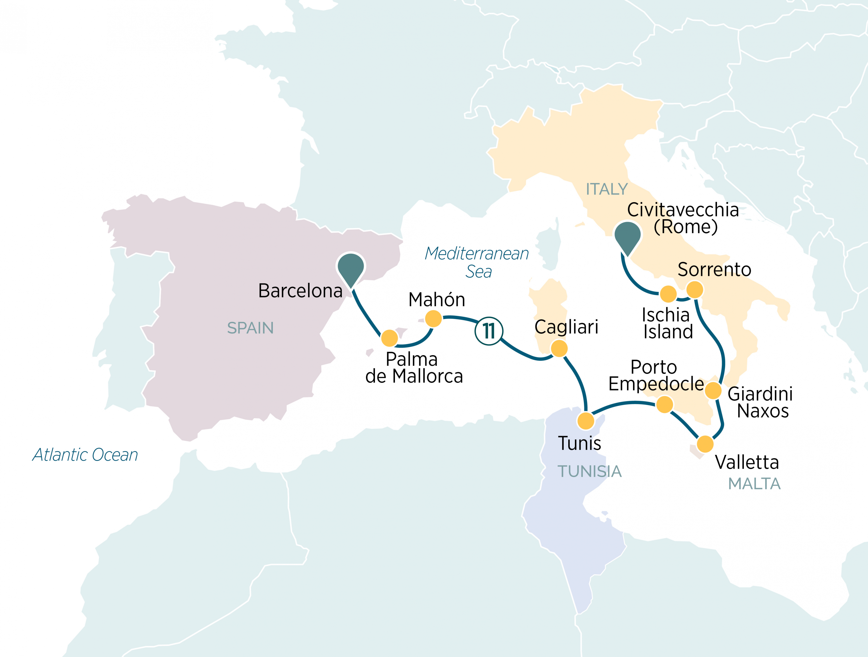 Embark on an unforgettable 12-day journey across the Western Mediterranean, beginning in the vibrant city of Barcelona and tracing a path through sun-kissed Spanish islands, the cultural mosaic of North Africa, and the timeless beauty of the Italian coast. From the Gothic grandeur of Palma de Mallorca and the natural serenity of Menorca to the historic medinas of Tunis and the ancient ruins of Sicily, each stop reveals a new layer of history, flavour, and charm. Discover the compact capital of Malta and Italy’s most iconic coastal gems — including Taormina, Sorrento, and the thermal haven of Ischia — before concluding in Civitavecchia, gateway to Rome. With a relaxing day at sea on the itinerary, you’ll get to make the most of the indulgent features on board your luxury Emerald Cruises yacht.