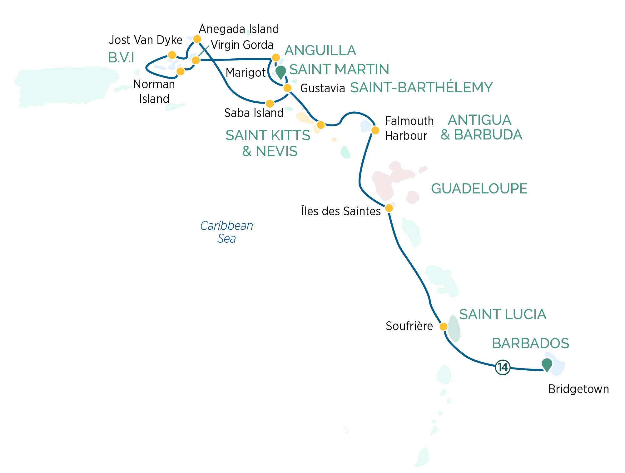 Start:Marigot, Saint Martin, Guadeloupe