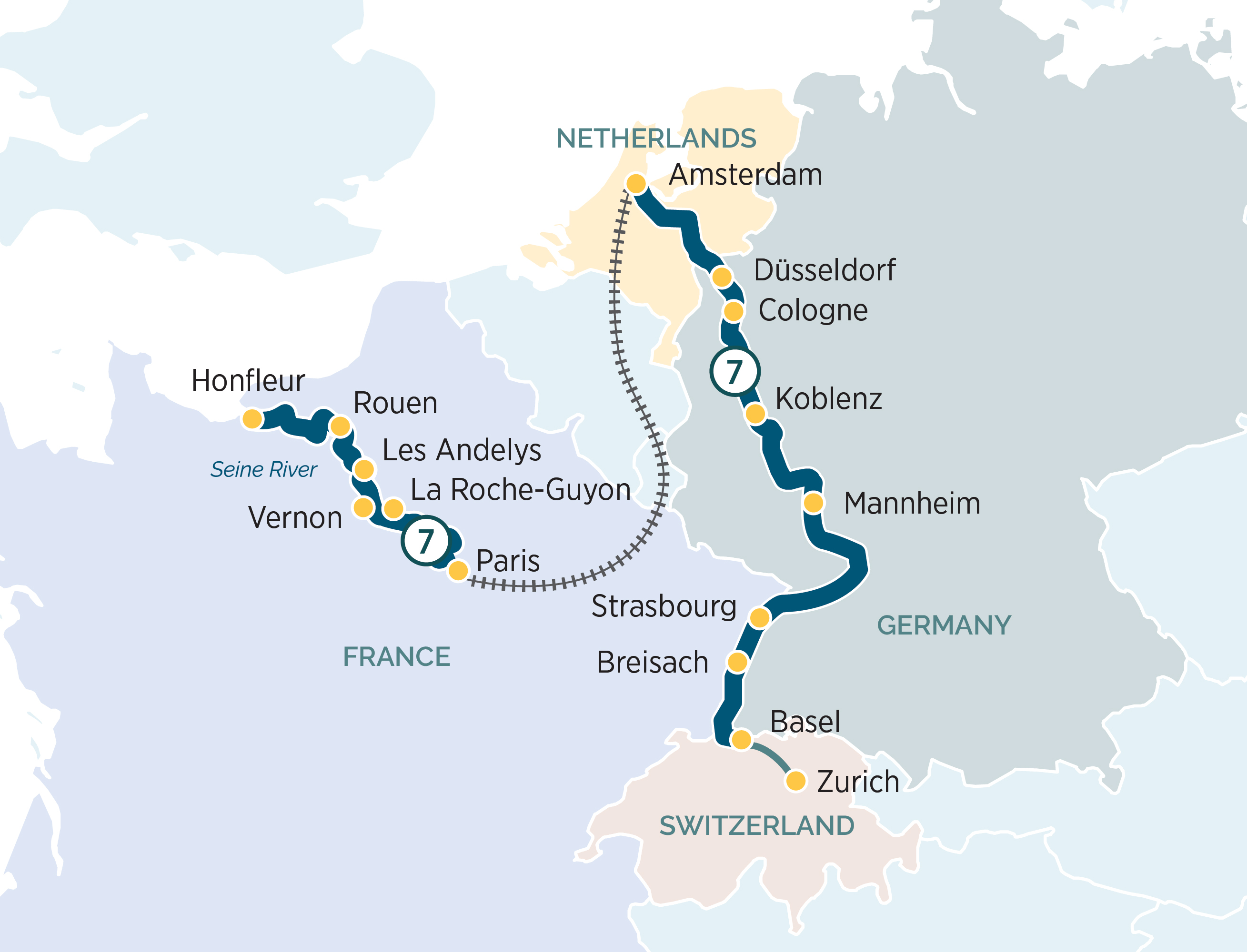 Today, you’ll arrive in Strasbourg, a city shaped by both French and German influences and renowned for its fascinating history and beautiful architecture. Once a key medieval trading centre and later part of the German Empire, Strasbourg’s World Heritage-listed Neustadt district showcases grand 19th-century boulevards and impressive imperial buildings. Its historic core, centred around the magnificent cathedral, reflects centuries of cultural exchange and shifting borders. Strasbourg also lies at the heart of the celebrated Alsace wine region, where charming villages and vineyard-covered hillsides are never far away.