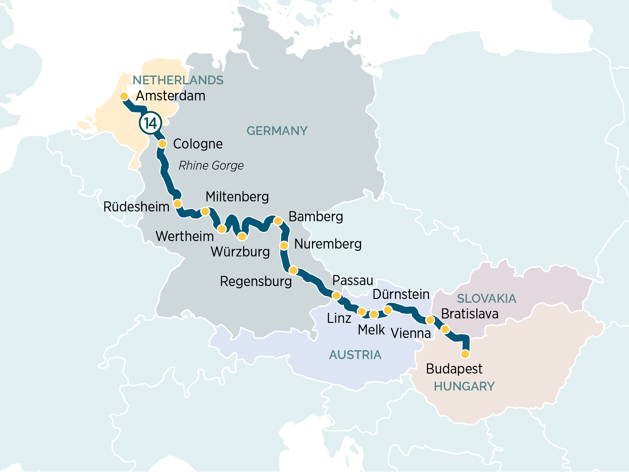 Journey through the heart of Europe on an unforgettable 15-day luxury cruise, tracing the timeless Rhine, Main and Danube rivers from Amsterdam to Budapest. Cruise through the continent’s celebrated highlights as you travel through the Netherlands, Germany, Austria, Slovakia and Hungary. Experience a vibrant tapestry of grand capitals and charming riverside towns, from the Gothic spires of Cologne to the esteemed wine villages of the Rhine, the elegant architecture of Vienna and the dramatic landscapes of the Wachau Valley.