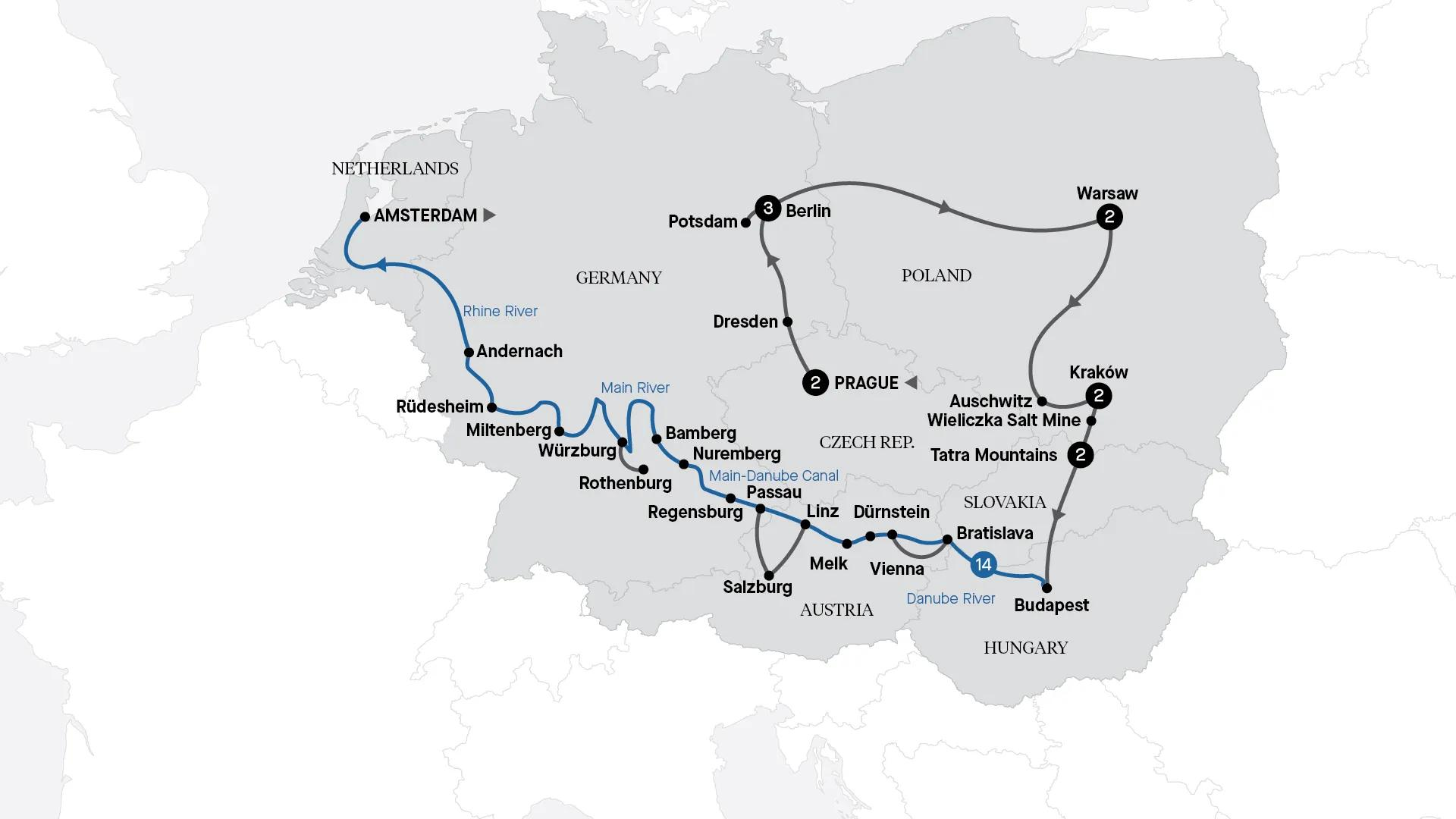 Enter a world of contrasts, from fairytale Prague to modern-day Berlin. Venture into Poland and delve into the sobering history of World War II at Auschwitz. Visit the World Heritage-listed Wieliczka Salt Mine, then embark on a 14-night luxury river cruise from Budapest to Amsterdam.