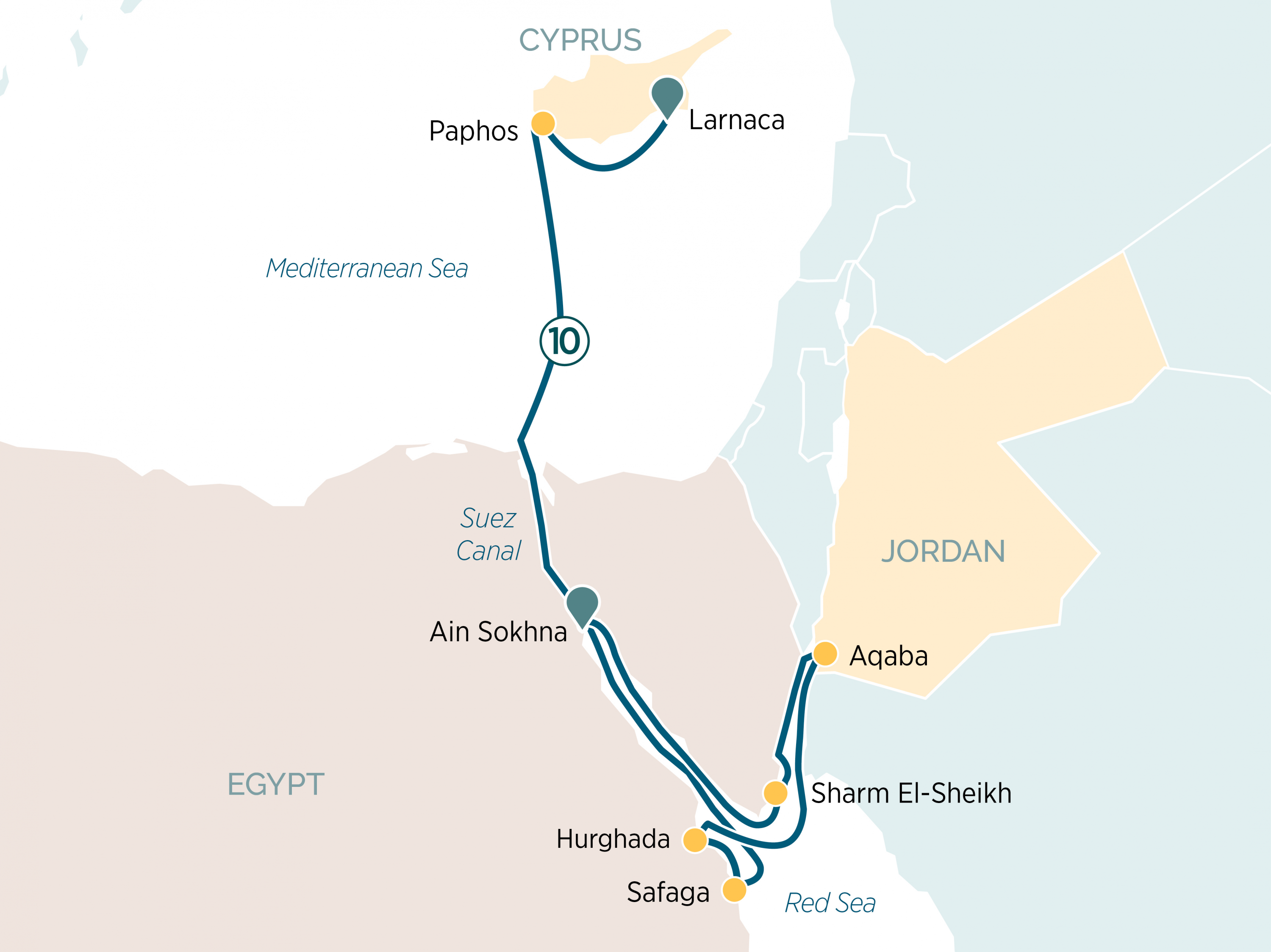 This remarkable journey begins in Ain Sokhna on Egypt’s Red Sea coast and explores some of the region’s most captivating destinations. Discover the resort charm of Sharm El Sheikh, the historic gateway of Aqaba to the ancient city of Petra, and the vibrant seaside towns of Hurghada and Safaga. Experience the unforgettable passage through the iconic Suez Canal before crossing into the Mediterranean, where the charming Cypriot ports of Paphos and Larnaca await with rich history, culture, and sun-drenched coastlines.