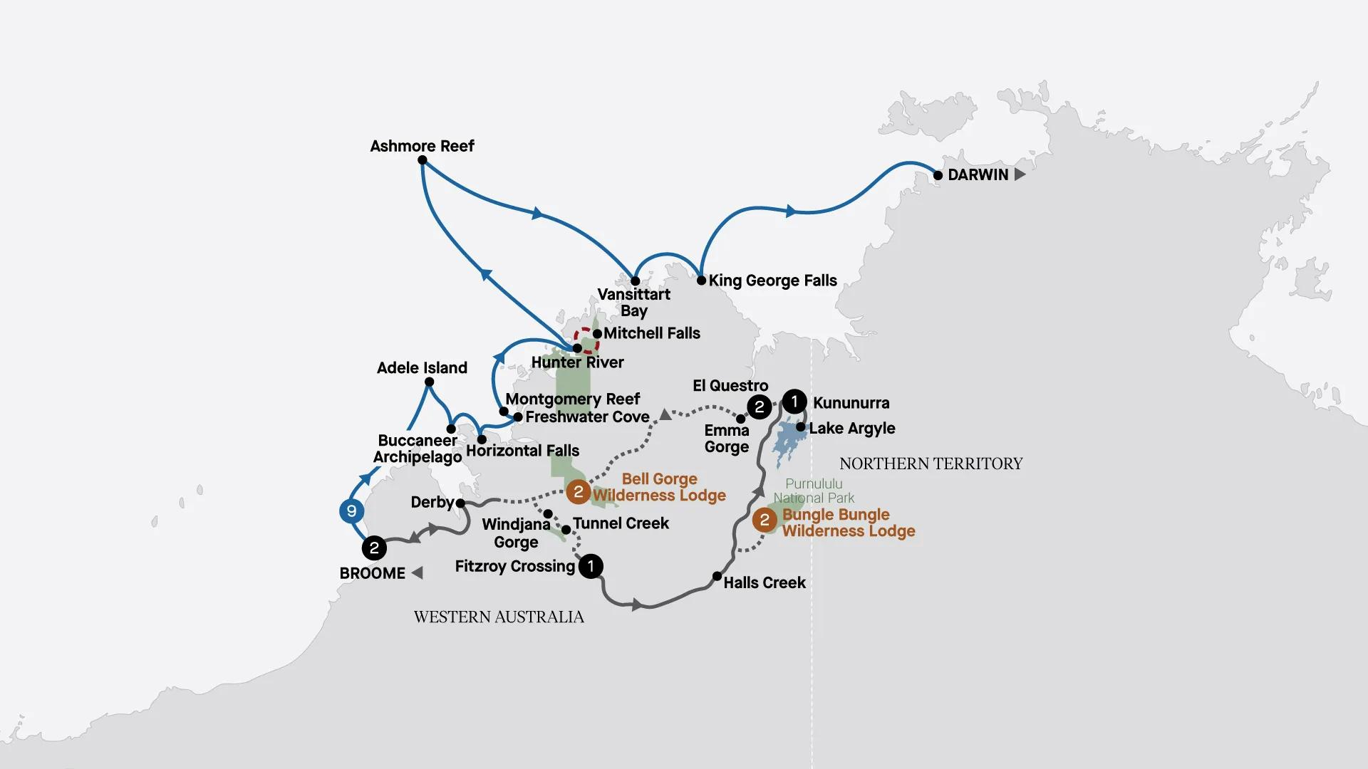 From the vast wilderness of El Questro to the fiery red landscapes of Purnululu National Park, you'll be left captivated. On this journey, you'll also cruise the spectacular Kimberley Coast for nine nights.