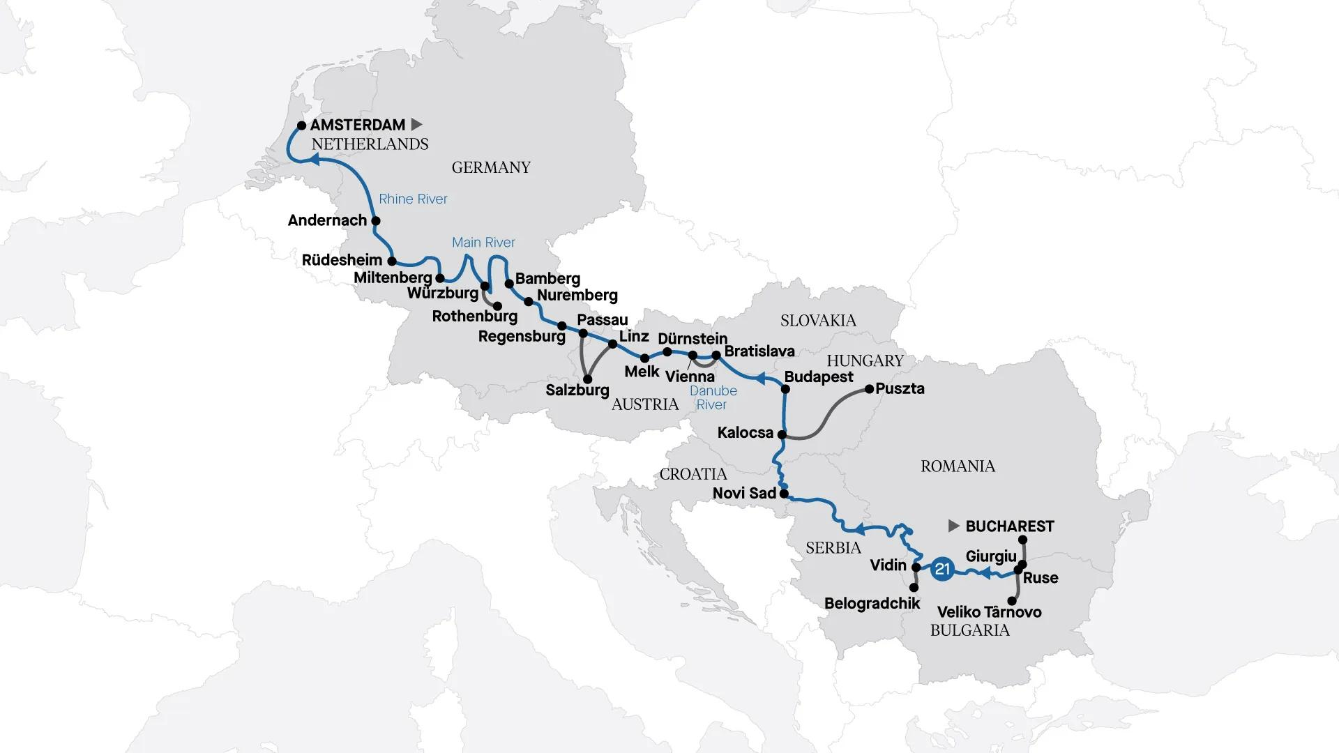 Our most in-depth journey on Europe’s waterways. Board your luxury river ship in Romania and cruise the Danube, stopping to explore riverside towns in Bulgaria, Croatia, Hungary and Austria. Continue through Germany along the Main and Rhine rivers to Amsterdam.