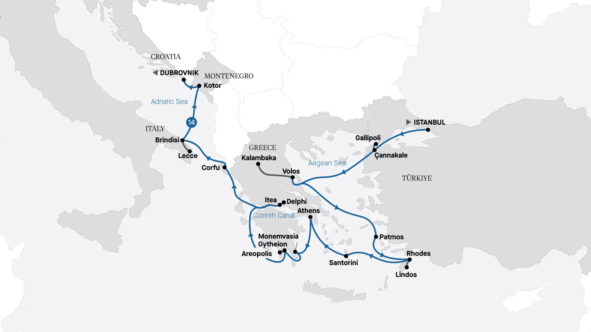 Embark on an extraordinary journey from Istanbul to Dubrovnik, discovering the coastal treasures of the Aegean, Ionian, and Adriatic seas. Begin in Istanbul, a legendary city at the crossroads between Asia and Europe. During you cruise, step ashore to wander the charming cobbled streets of medieval towns and cities, and marvel at impeccably preserved archaeological sites that speak to the grandeur of ancient civilizations. Follow the irresistible aroma of freshly baked local delicacies and indulge in a tasting. Your voyage culminates in Dubrovnik, celebrated for the magnificent fortified walls that encircle the UNESCO-listed Old Town.
