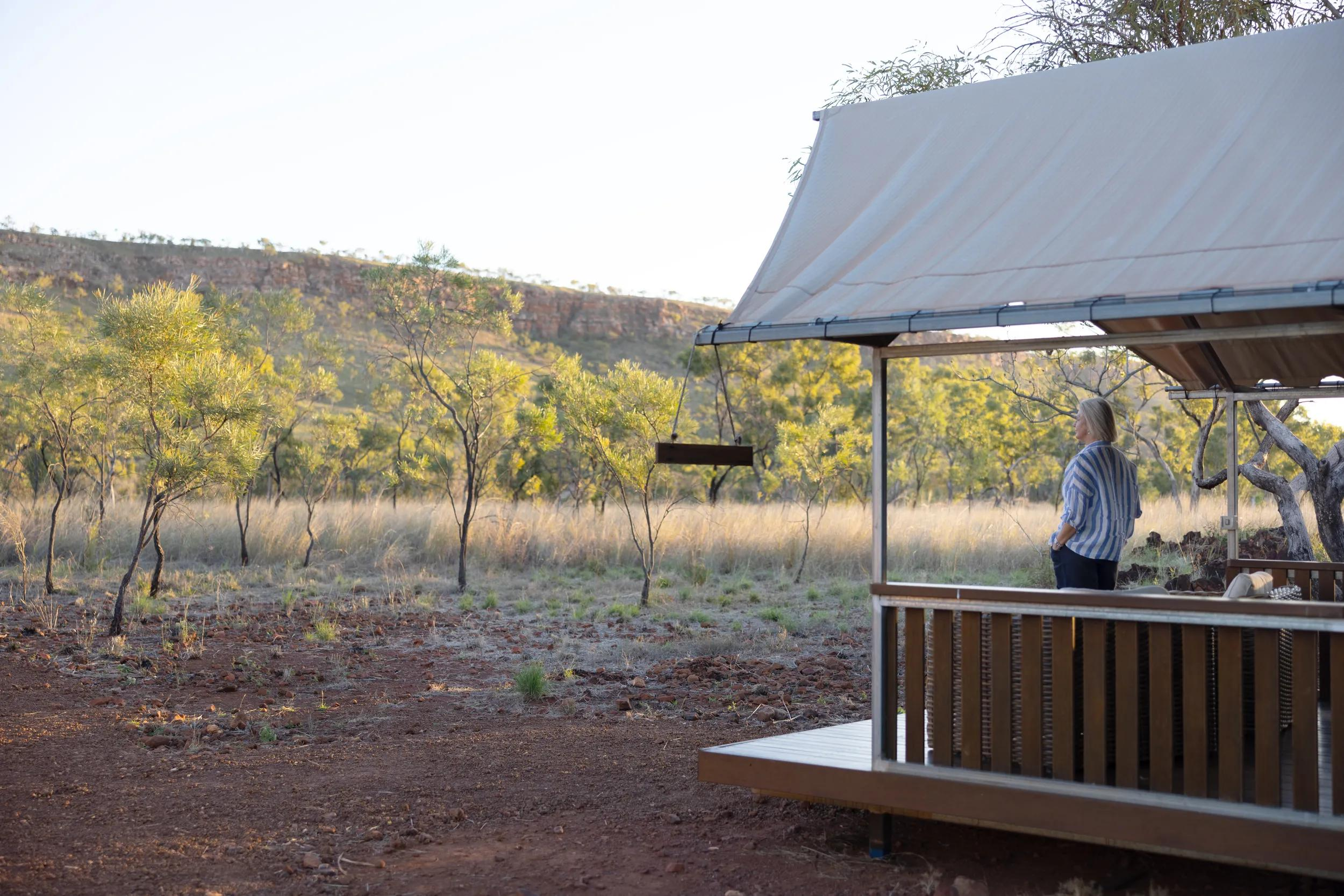 Partnered with the Indigenous Imintji community, APT’s Bell Gorge Wilderness Lodge overlooks the stunning Wunaamin Miliwundi Ranges. The lodge features an open-air dining area and bar, large private tent cabins with private decks overlooking the escarpment, plush interiors and an en suite with a walk-in waterfall shower.