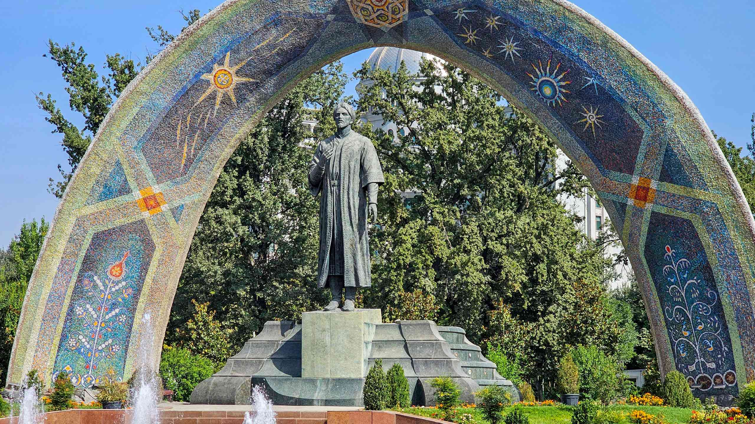 Our next stop — leafy Oak Park, home to an open-air sculpture gallery that’s a whimsical feast for the eyes. Created for the 1984 ‘All Union Sculptors Symposium’ in Bishkek, this sculpture garden celebrates “Work and Peace” and commemorates 60 years of Kyrgyzstan joining the Soviet Union. Then it’s on to Victory Square, where a yurt-inspired monument stands in tribute to the 40th anniversary of the end of World War II.