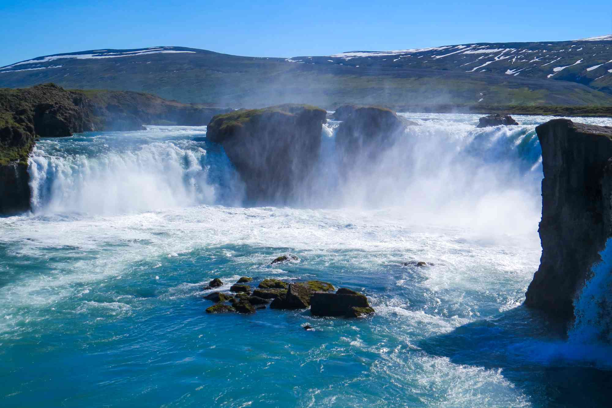 We’ll enjoy some free time in this beautiful city to explore at our own pace, before continuing on to our next stop, the mythical Goðafoss Waterfall. This spectacular waterfall has to be seen to be believed. Goðafoss cascades over a curved edge spanning over 30 metres in width and falls 12 metres deep into a bright blue pool at the bottom.