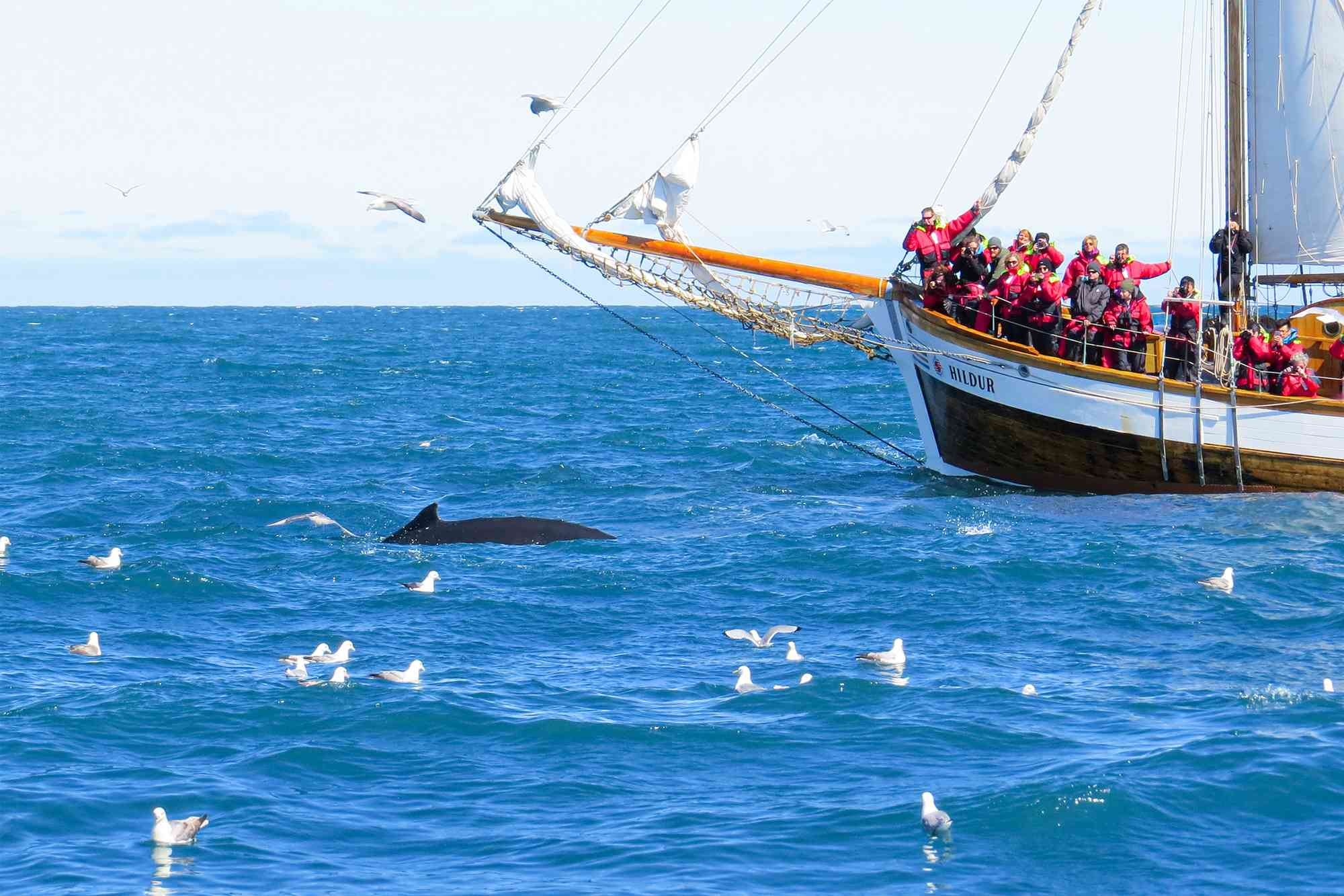 Embark on an unforgettable whale watching cruise in Húsavík, aboard a traditional Icelandic oak ship.