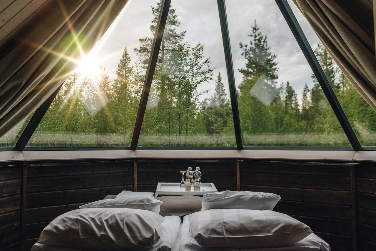 Set in the quiet forests near Ivalo in far northern Finland, this summer Lapland itinerary is a restorative escape shaped by nature, gentle activity and Arctic light. You’ll stay at a cosy, family-run glass igloo resort, where your Aurora Glass Cabin is tucked among the trees, perfectly positioned for lingering sunsets and the soft glow of the midnight sun filtering through the night.