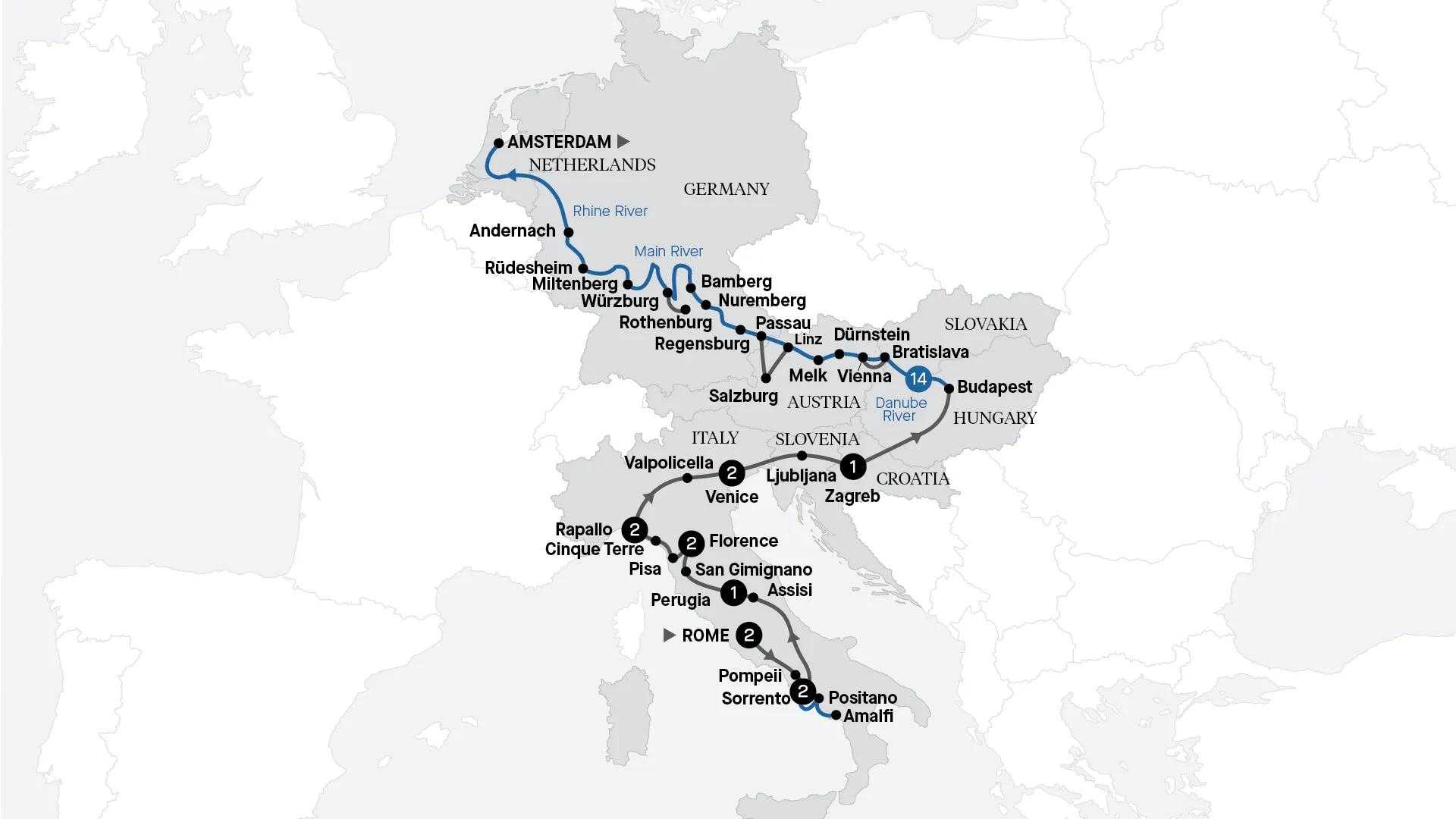 Uncover Italy's endless wonders, from ancient Rome to the haven of Sorrento. Art aficionados will rejoice in Florence, while ocean lovers will revel in the coastal charm of Rapallo and the Cinque Terre. After touring Italy, join an unforgettable river cruise from Budapest to Amsterdam.