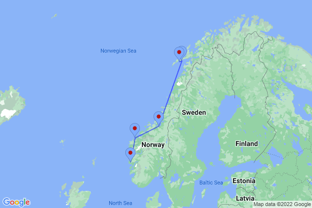 - 3 nights twin outside cabin with private facilities aboard Norwegian Coastal ship