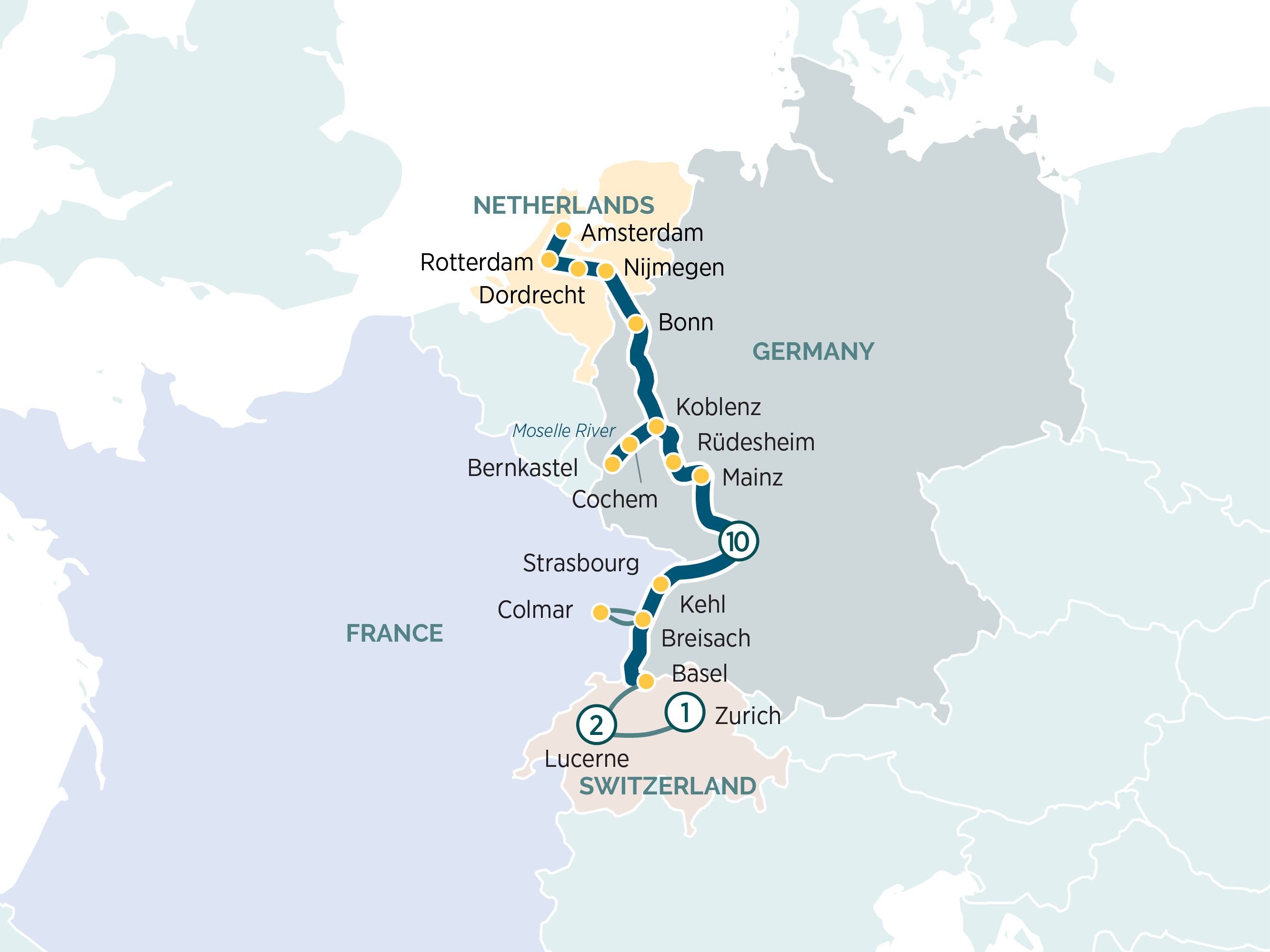 Explore a landscape of sun-drenched vineyards, magnificent castles, and quaint villages along the Rhine & Moselle rivers. Begin in the serenity of Switzerland in Basel, travel to the Alsatian capital of Strasbourg. Traverse the wonderful countryside, stopping in Koblenz, where the Rhine and Moselle meet. You will then continue to the Netherlands with a tour of the quintessentially Dutch cities of Amsterdam and Utrecht with a visit to the traditional Kinderdijk windmills.