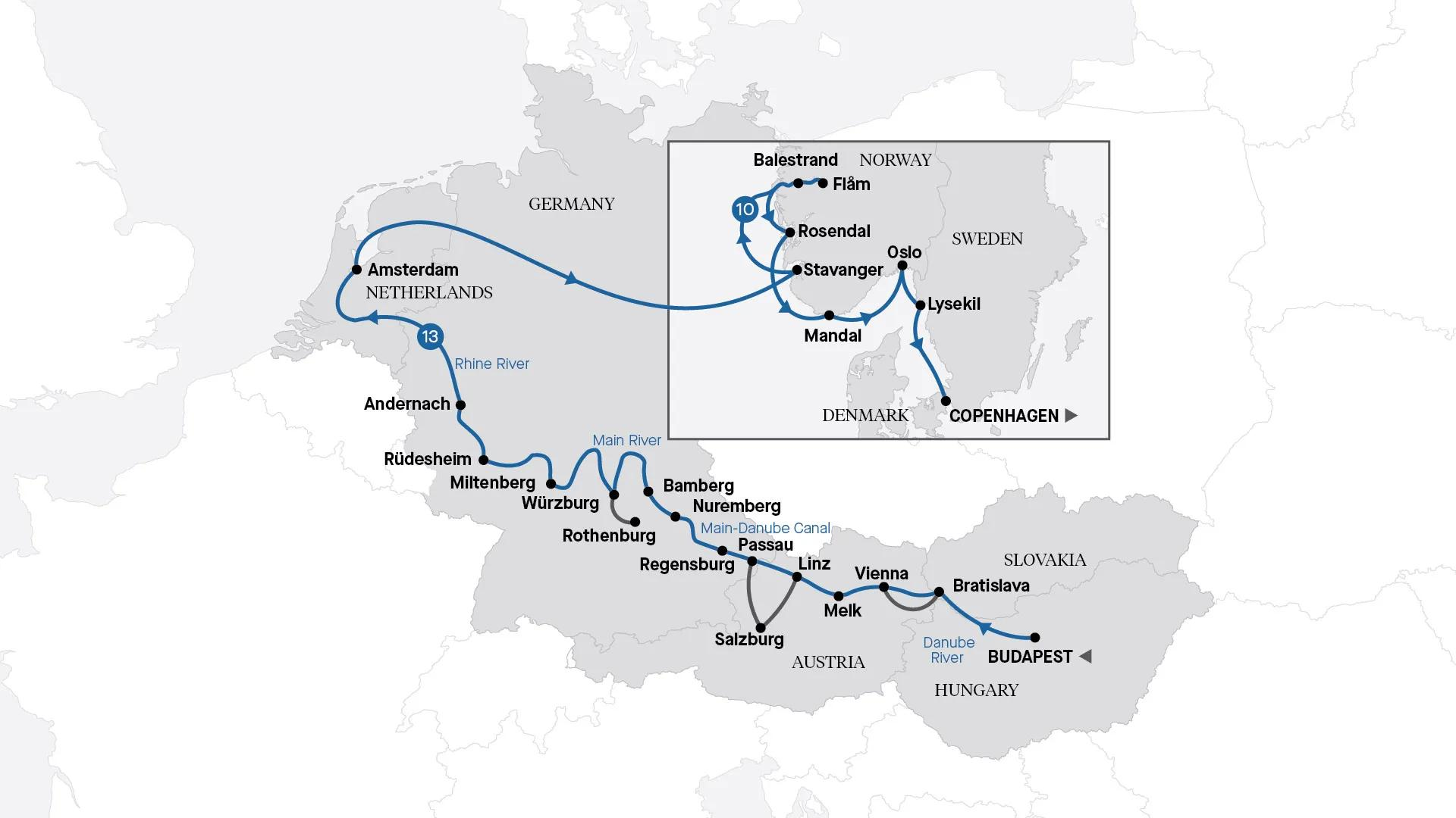 Journey through the heart of Europe and the breathtaking coasts of Scandinavia on this extraordinary voyage. Begin with a luxury river cruise along the Rhine, Main and Danube, where grand cities like Budapest, Vienna and Amsterdam meet storybook villages tucked along the waterways. Then continue north, sailing across the North Sea to Norway’s fjord country. Here, sheer cliffs, cascading waterfalls and glassy waters frame charming towns such as Flåm and Balestrand, while historic ports like Stavanger and Rosendal reveal a rich cultural heritage. Conclude your journey in Copenhagen, a vibrant city where royal palaces and cobbled streets mingle with modern design. From Europe’s iconic rivers to Scandinavia’s natural wonders, this journey captures the very best of two remarkable worlds.