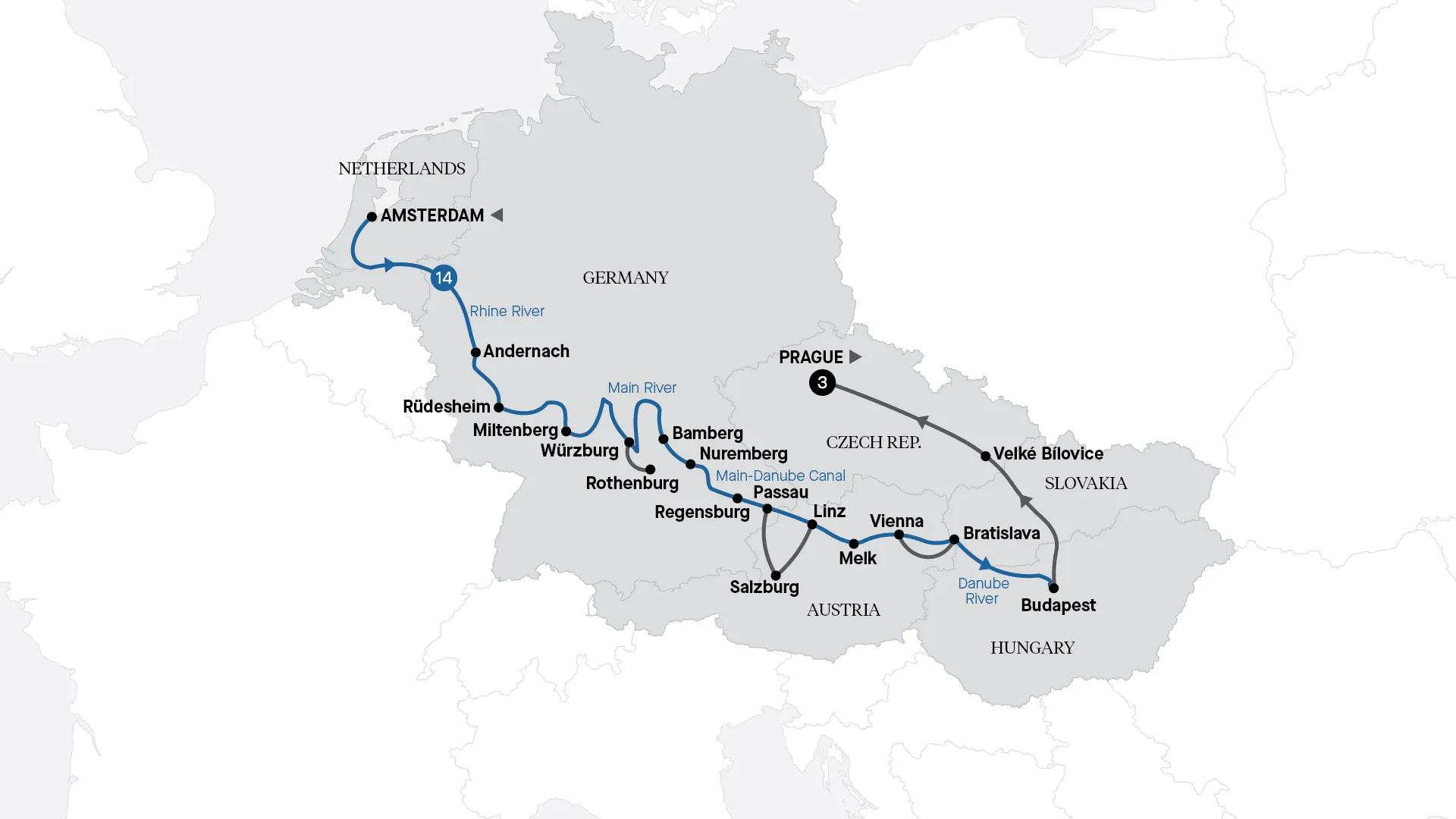 Board your Magnificent Europe Cruise from Amsterdam to Budapest, travelling on the Rhine, Main and Danube rivers through fairytale settings. Then, travel on to Prague for a three-night stay in this enchanting city.