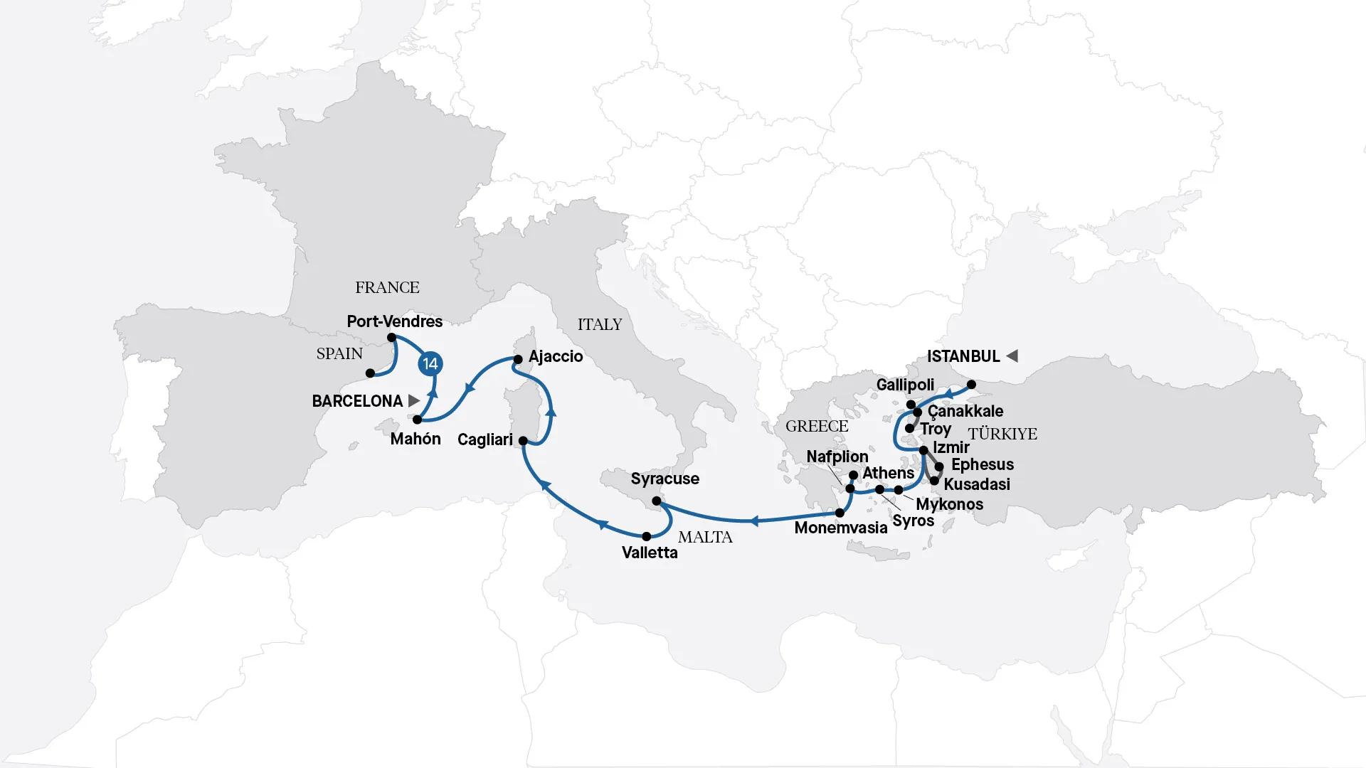 Explore Mediterranean wonders on a 14-night ultra-luxury cruise from Istanbul to Barcelona aboard the Seabourn Venture. Highlights include visiting the Gallipoli Peninsula, the ancient city of Ephesus, the Acropolis of Athens, Sicily, Malta, Corsica and Menorca. Discover breathtaking islands, iconic landmarks, rich history and local cuisine.