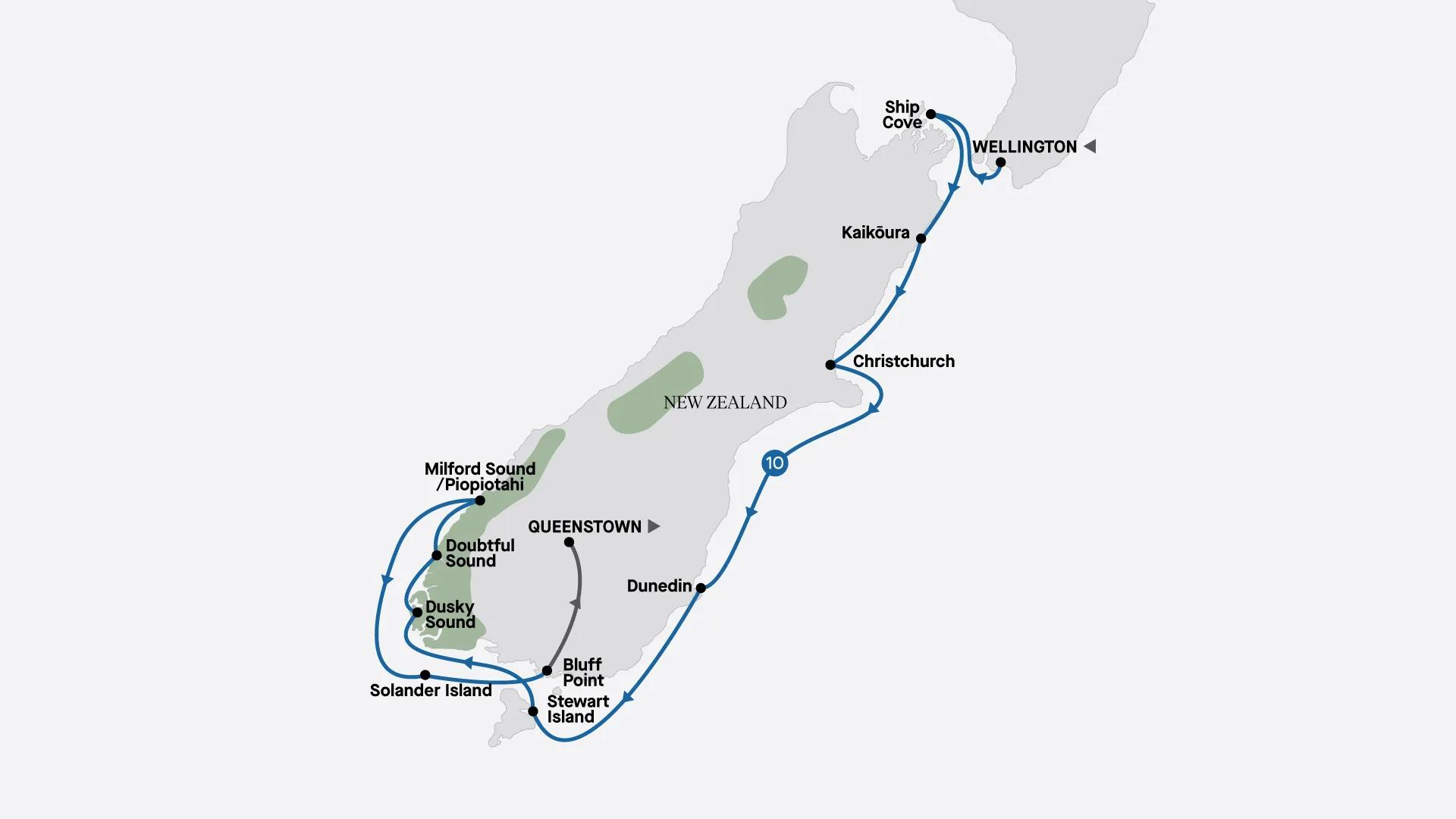 Marvel at the awe-inspiring beauty of New Zealand's South Island on this 11-day small ship cruise. In Kaikoura, the country's premier whale-watching destination, keep your eyes peeled for the fluke of a whale's tail as it plunges to the depths of the ocean, while in Fiordland National Park, part of a wider UNESCO World Heritage-listed area, marvel at the jaw-dropping natural beauty of Milford, Dusky and Doubtful sounds, filled with forest-covered mountains and thundering waterfalls.