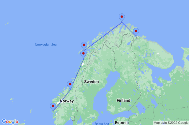From the tip of Norway, voyage south along the spectacular Norwegian coast. Travel along the beautiful coast of Norway from Kirkenes to Bergen, and get to experience the world's most scenic sea voyage. The 6 day voyage south calls at over 30 ports, clinging close to the coast as you weave through the legendary Lofoten Islands famous for stunning nature and idyllic fishing sites.