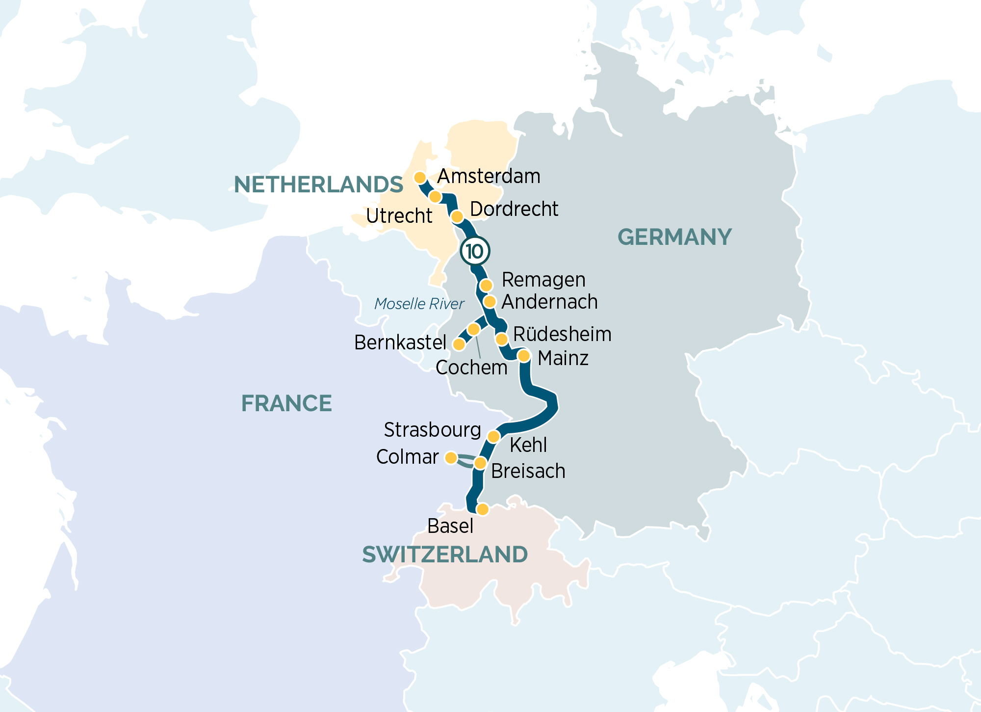 Explore a landscape of sun-drenched vineyards, magnificent castles, and quaint villages along the Rhine & Moselle rivers. Begin in the Netherlands with a tour of the quintessentially Dutch cities of Amsterdam and Utrecht before a visit to the traditional Kinderdijk windmills. You will then continue to Germany, traversing the wonderful countryside, stopping in Koblenz, where the Rhine and Moselle meet. After exploring the picture-perfect Moselle, travel south to the Alsatian capital of Strasbourg, followed by the serenity of Switzerland in Basel.