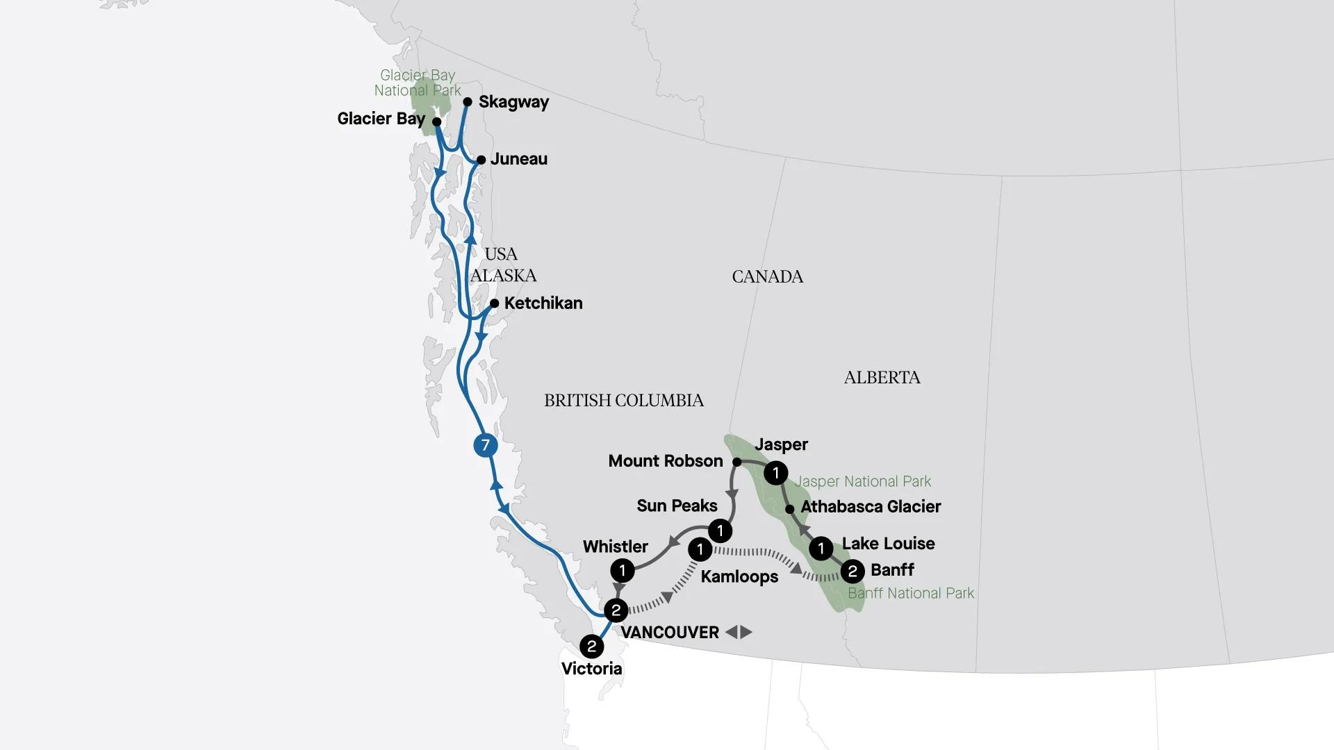 Experience the best of Canada and Alaska on this fast-paced adventure. Ride the iconic Rocky Mountaineer, explore Banff and Whistler, and enjoy exclusive experiences like before-hours access to The Butchart Gardens and a meet and greet with a Mountie. Then, cruise through Alaska’s Inside Passage, where breathtaking nature awaits. Image courtesy of Rocky Mountaineer.