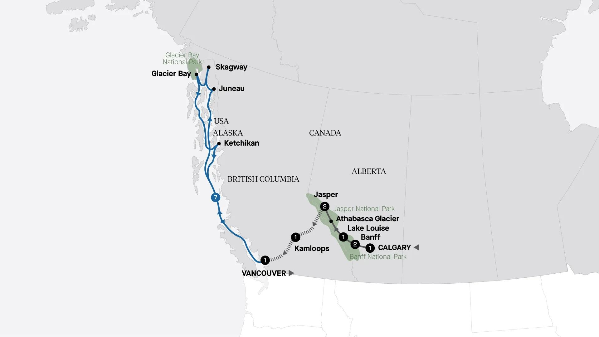 This tour offers the perfect combination of icons and lesser-known wonders. Stay at the ‘Castle in the Rockies’ and embark on an unforgettable Rocky Mountaineer rail journey. Conclude your holiday with an extraordinary cruise through Alaska's Inside Passage.