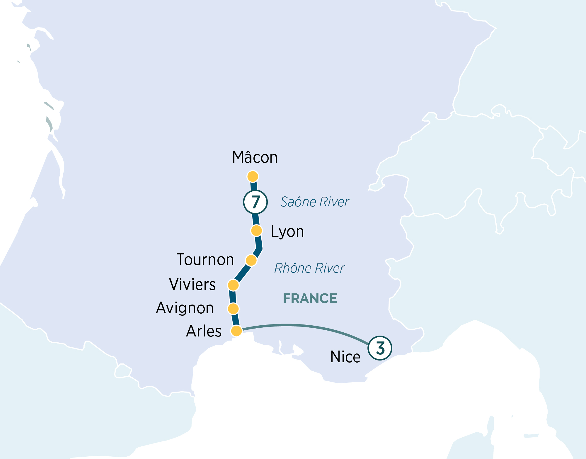 The Rhône and Saône rivers meander through the picturesque south of France, where you’ll discover picture-perfect villages, palaces and Roman ruins, and delicious Provençal cuisine.