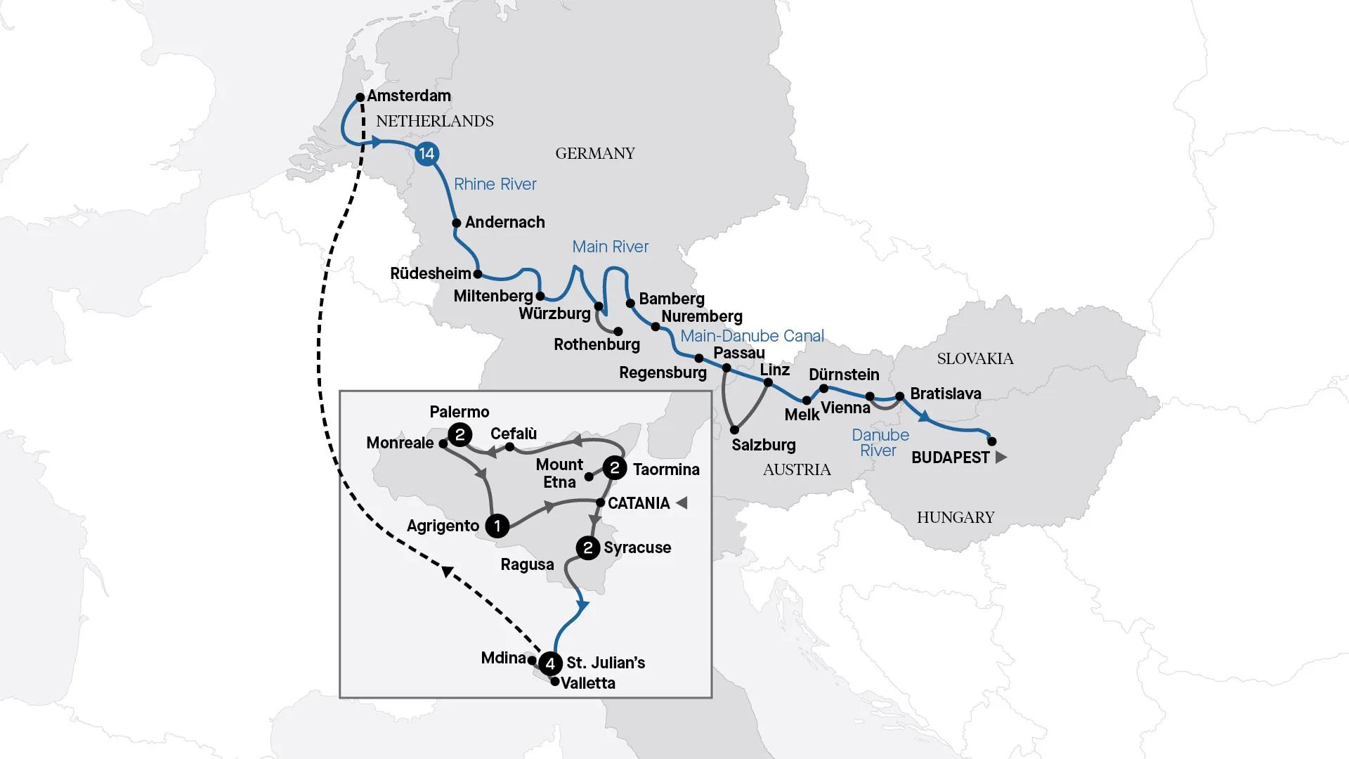 Then, fly from Valletta to Amsterdam to embark on your 14-night Magnificent Europe cruise, tracing Central Europe’s legendary rivers all the way to Budapest. explore enchanting hilltop castles, opulent palaces, and ornate churches in the region’s medieval towns and cities.