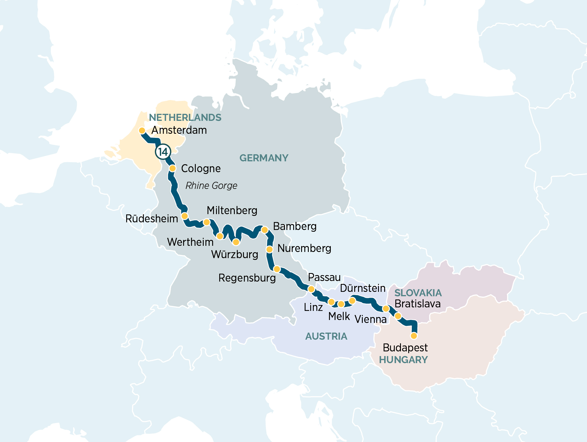 Begin your journey on the iconic Danube river with a traditional Hungarian folklore performance. Over the next fourteen days, sail through the stunning Wachau Valley and the Rhine Gorge, making your way to the canal city of Amsterdam. Along the way explore stunning cities and towns like Vienna and Cologne.
