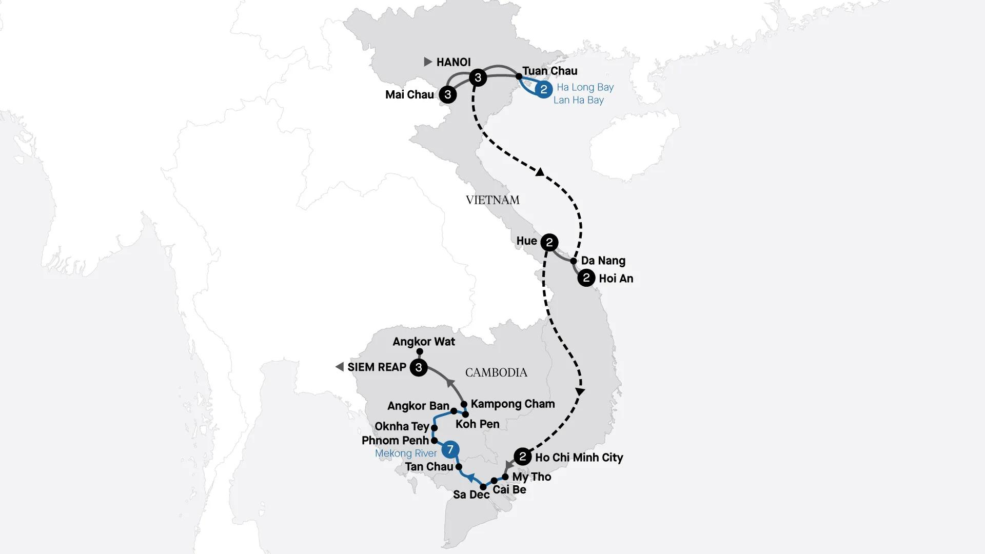 Join APT’s most comprehensive luxury tour of Vietnam and Cambodia. Spend seven nights aboard the luxurious Mekong Serenity cruising from My Tho to Siem Reap, the gateway to Angkor Wat, and cruise Ha Long Bay for three days. Explore Mai Chau and glide along the Perfume River in Hue.