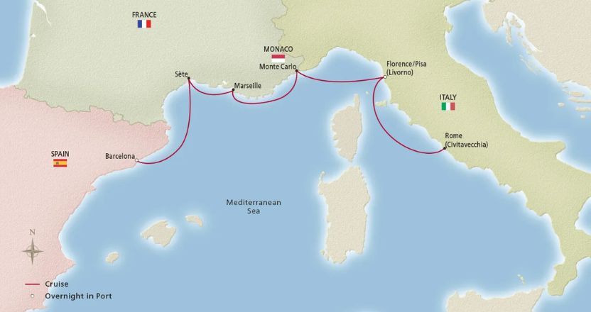 Trace the shores of the Mediterranean coast with calls to Spain, Italy and France’s famed Riviera. Immerse yourself in Catalonian and Tuscan art, architecture and history during overnights in Barcelona and Tuscany. In the South of France, stroll the network of canals in Sète, immerse yourself in nature in the Calanques National Park and visit Monte Carlo, Monaco’s glamorous city by the sea, a blend of old-world elegance with modern luxury.