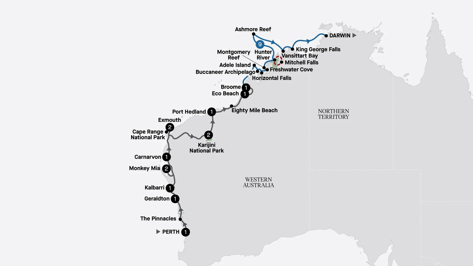 Embark on a 24-day adventure from Perth to Darwin. Explore Nambung National Park, Monkey Mia, Ningaloo Marine Park, Karijini National Park and more. Discover historical sites, Aboriginal rock art, and stunning landscapes. Join the luxurious Seabourn Pursuit for a Kimberley Coast cruise, visiting Adele Island, Buccaneer Archipelago, Horizontal Falls, and more.