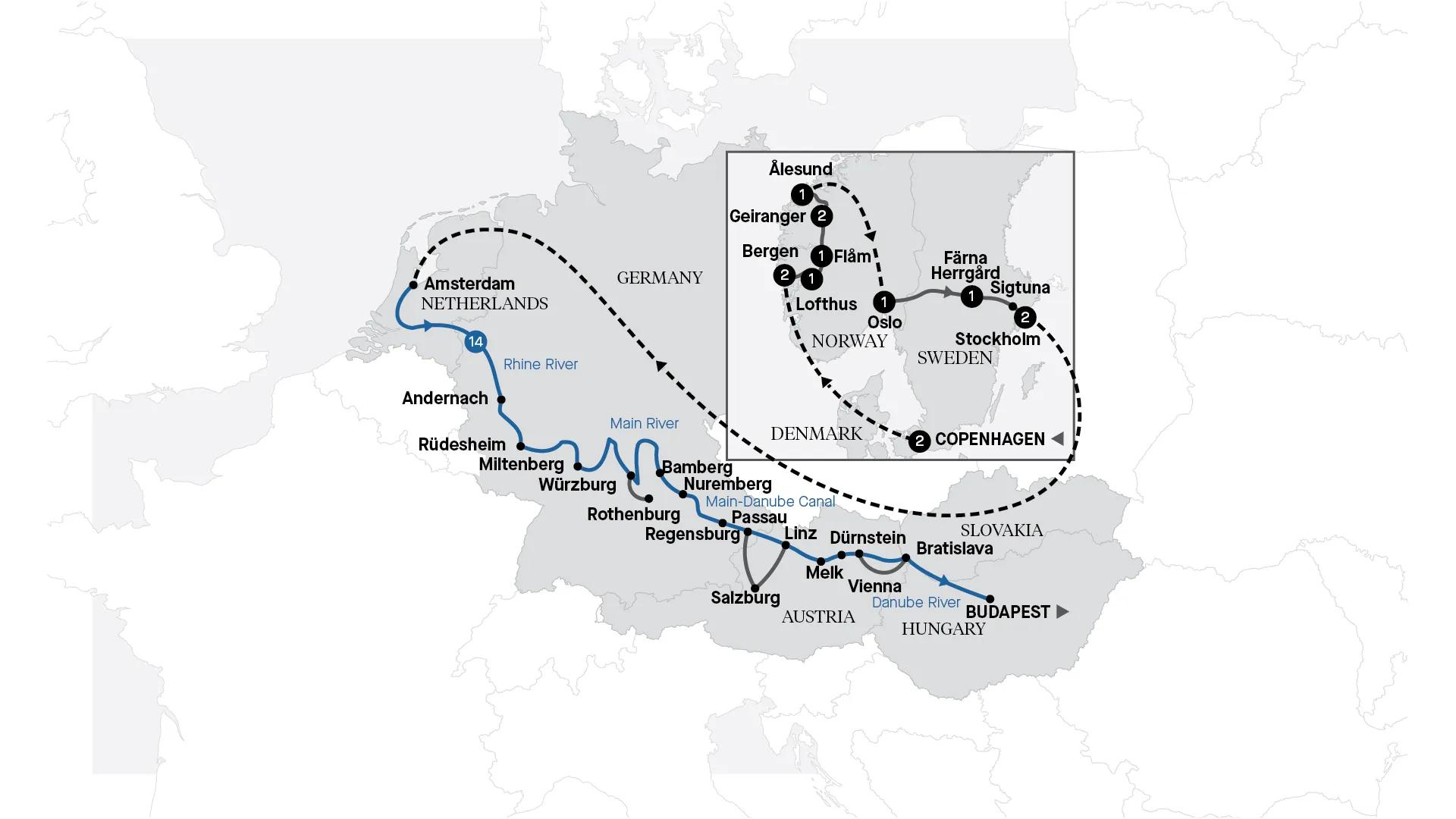 Embark on a Scandinavian adventure, exploring Bergen, riding the Flåm Railway and visiting glaciers. See Oslo, Stockholm and Swedish medieval towns. Then, take a luxury river cruise from Amsterdam to Budapest, discovering German towns and Vienna's landmarks.
