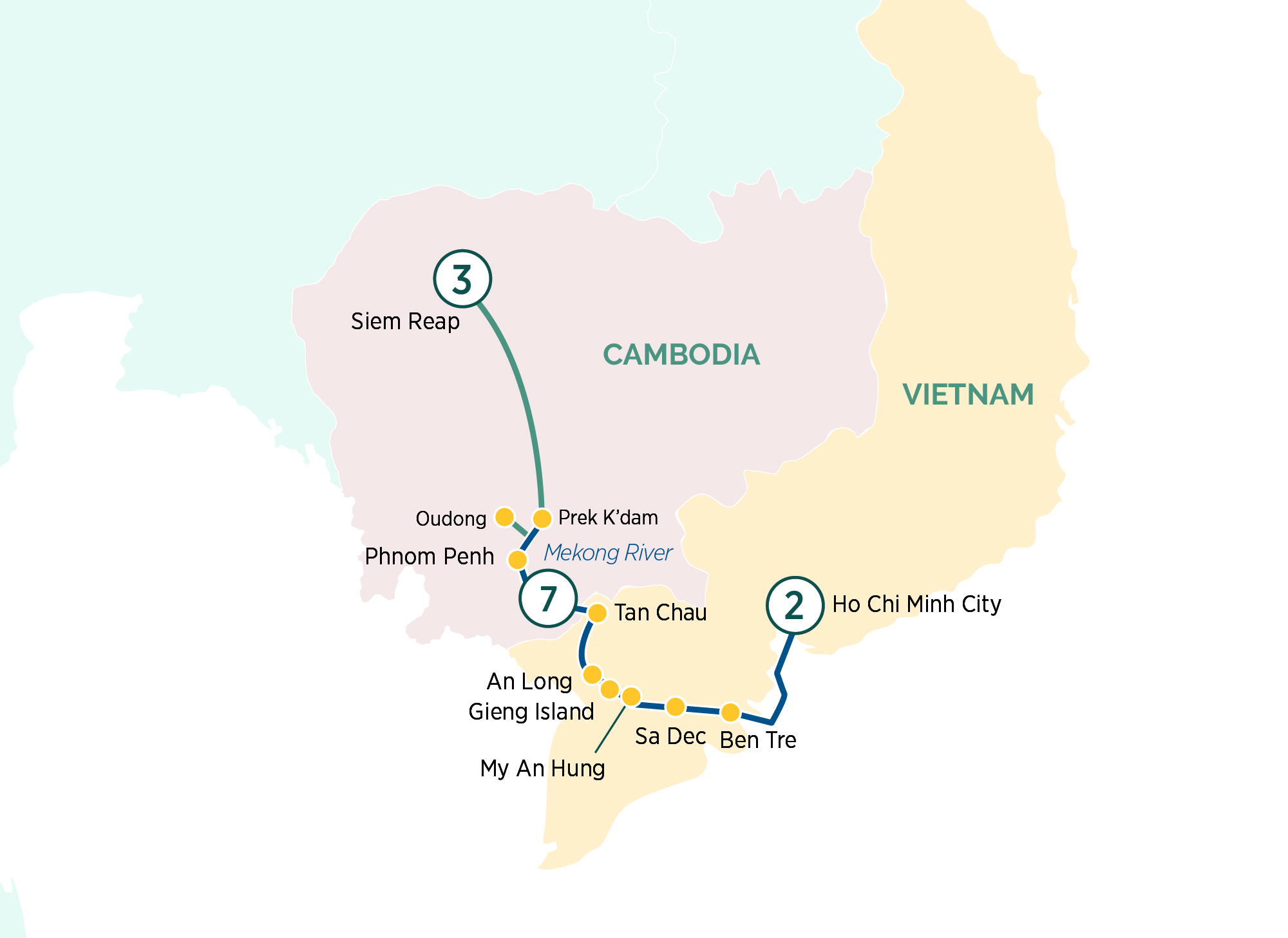 Your journey begins in Ho Chi Minh City, a bustling metropolis and one of the most vibrant cities in Vietnam. From there, you’ll witness the traditional way of life found in Ben Tre and on Gieng Island, stopping to explore My An Hung village and the Cao Dai Temple in Tan Chau along the way. Crossing the border into Cambodia, you’ll arrive at Phnom Penh before venturing to Siem Reap, where the otherworldly site of Angkor Wat awaits.