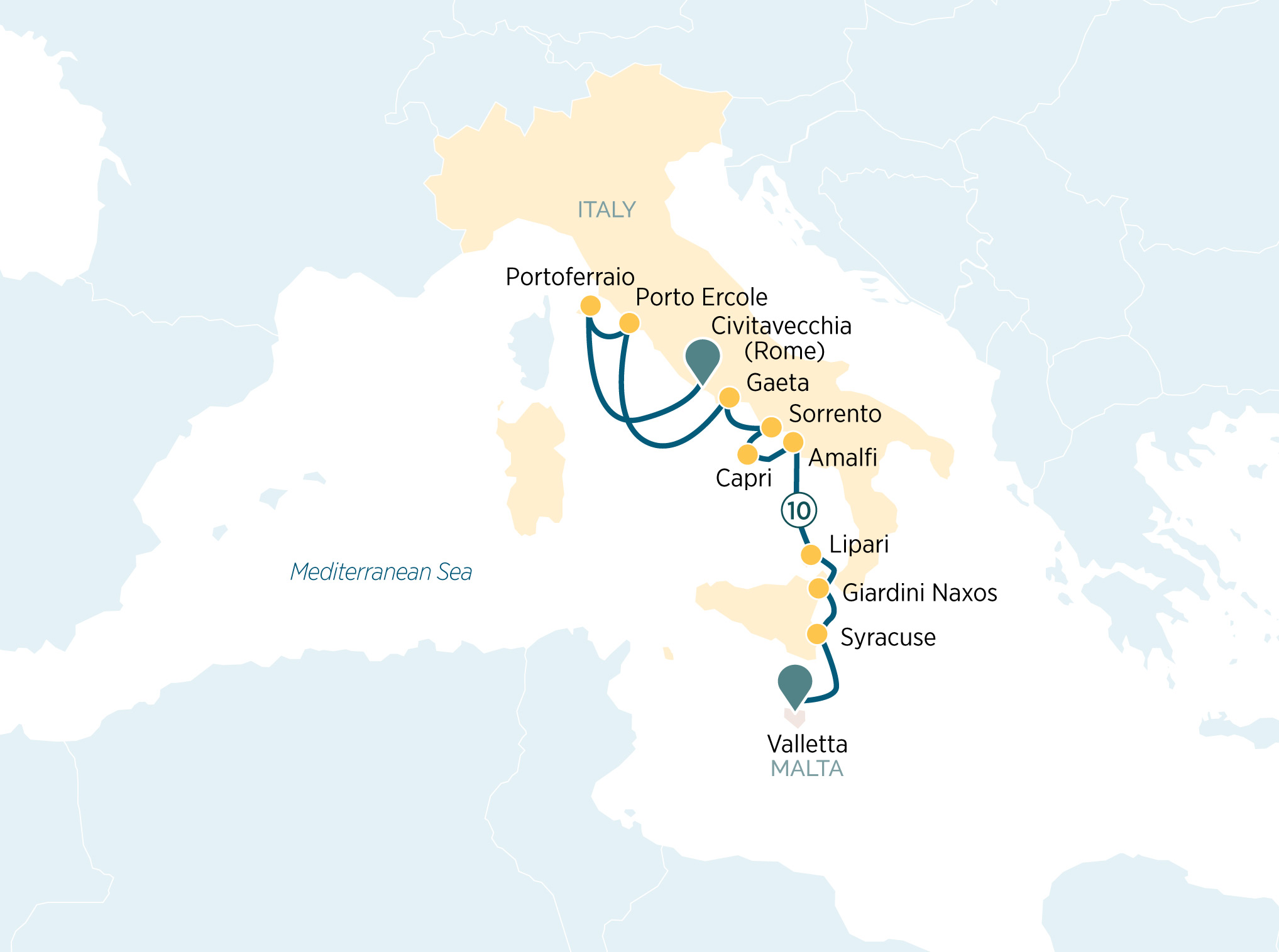 Begin your journey on the island-nation of Malta and its tiny capital, Valletta, a well-preserved fortified city and World Heritage-listed Site. From here, cruise to Italy and first stop, the stunning Island of Sicily, exploring the historic destinations of Syracuse and Giardini Naxos, both enthralling for their archaeological sites dating back to ancient Greek and Roman times. There’s ample opportunity to relax on the pristine beaches of Lipari, a striking volcanic archipelago. Cruising northwards along the Italian coastline, you’ll be entranced by the spectacular settings, cultural charm and mouthwatering regional cuisine as you explore Italy’s fabled Amalfi Coast, Bay of Naples and Island of Capri.